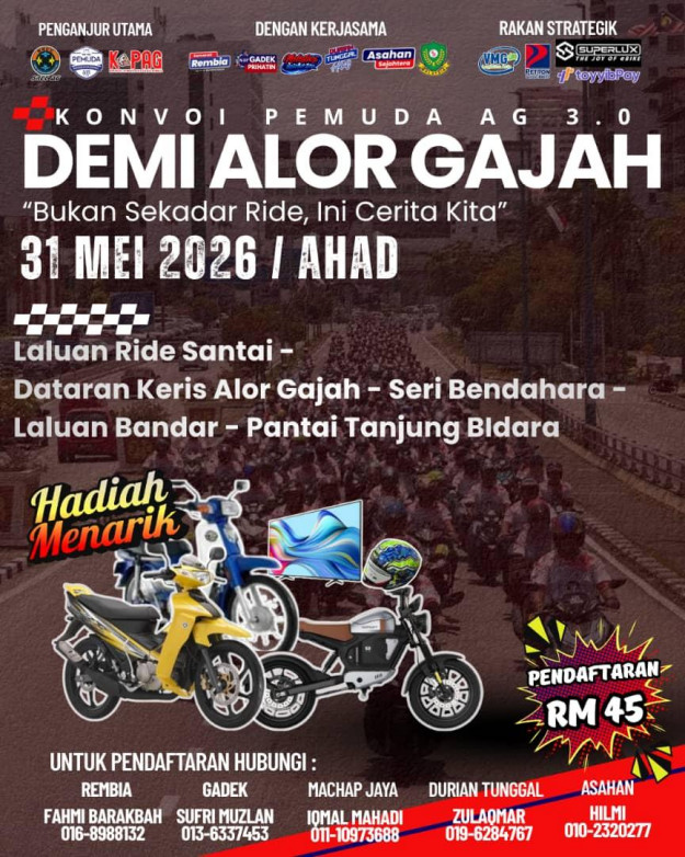 Setelah kejayaan luar biasa Konvoi Pemuda AG 2.0 pada September 2025 yang menghimpunkan lebih 750 peserta dan mencipta kenangan yang tidak dapat dilupakan, kini Pemuda UMNO Alor Gajah kembali dengan Konvoi Pemuda AG 3.0 – lebih besar, lebih meriah dan lebih bermakna!